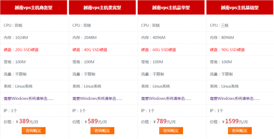 其次,說一下越南vps的價格優(yōu)勢。越南vps價格還算挺便宜,就拿宇塵網(wǎng)絡越南vps來說,CPU:雙核 內(nèi)存:1G 硬盤:20 G SSD 帶寬:100M IP:1個 價格為每月389元,且支持Linux和Windows系統(tǒng)的,相較于其他vps或者越南服務器而言,價格還算非常優(yōu)惠的,且適用范圍廣,能滿足大部分企業(yè)的需求。