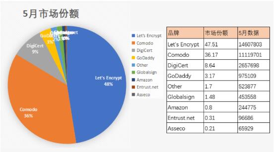 根據(jù)Netcraft的數(shù)據(jù)顯示,從2018年5月SSL證書市場占有率可以看出,Let’s Encrypt 以47.51%的市場占有率居頂,很大的原因是其提供了免費(fèi)的SSL證書申請,很受個人網(wǎng)站或博客的青睞。