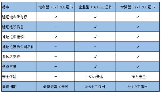 SSL證書分為三大類:DV型、OV型、EV型,企業(yè)可根據(jù)自身特點(diǎn)選擇相應(yīng)的SSL證書類型,下圖展示了Digicert/Symantec 不同類型的SSL證書特點(diǎn)及申請周期: