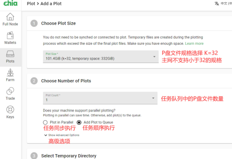 7,P盤文件格式選擇K=32,新手第一次播種P盤文件數(shù)量建議選擇1,臨時存儲空間選擇SSD固態(tài)硬盤(1個P盤線程需要占用332G的臨時空間,空間太小會造成播種失敗),最終P盤文件存放路徑可以選擇機械硬盤的分區(qū),K=32規(guī)格的P盤文件最終會占用101.4G硬盤空間。