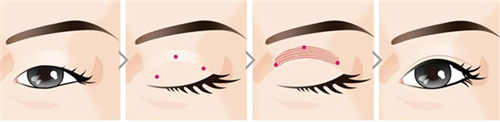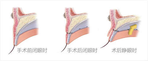 沿雙眼皮線對(duì)皮膚、肌肉、脂肪等進(jìn)行綜合處理,使眼外皮和睜開眼睛時(shí)活動(dòng)的肌肉之間形成粘著現(xiàn)象,進(jìn)而塑造出自然優(yōu)美的雙眼皮。注:切開法5~7天拆線